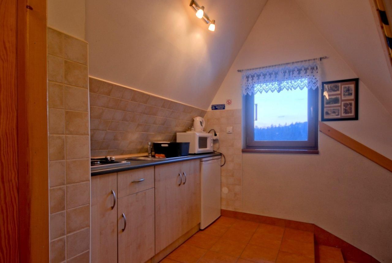 Each floor is equipped with a kitchenette consisting of a gas stove, microwave, fridge, kettle, dishes (pots, pans, cups, glasses, plates) and cutlery.